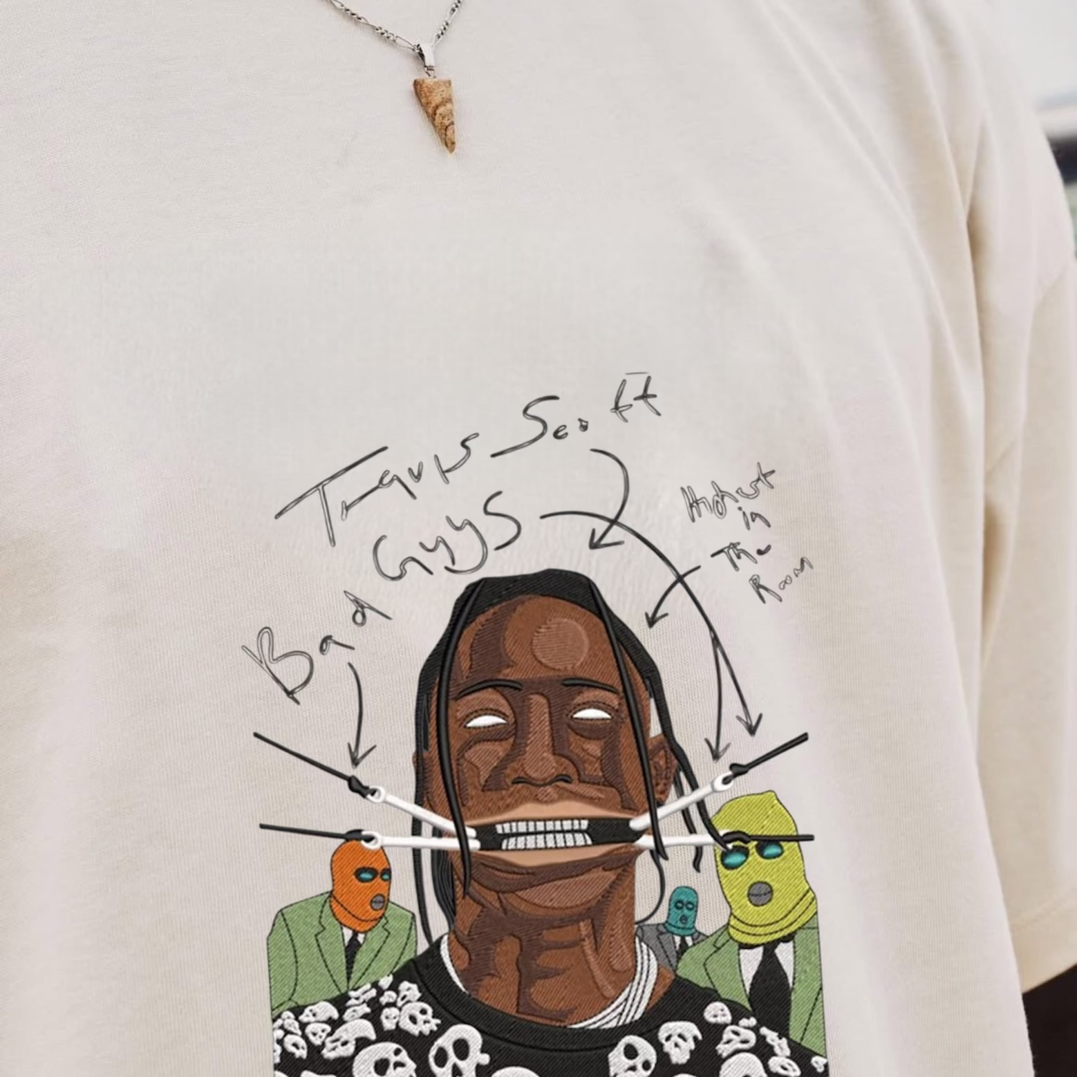 EMBROIDERED LOOSE-FITTING BLACK STREETWEAR T-SHIRT WITH A ROUND NECK AND A Travis Scott BAD GUY CLUB EMBROIDERY ON THE FRONT