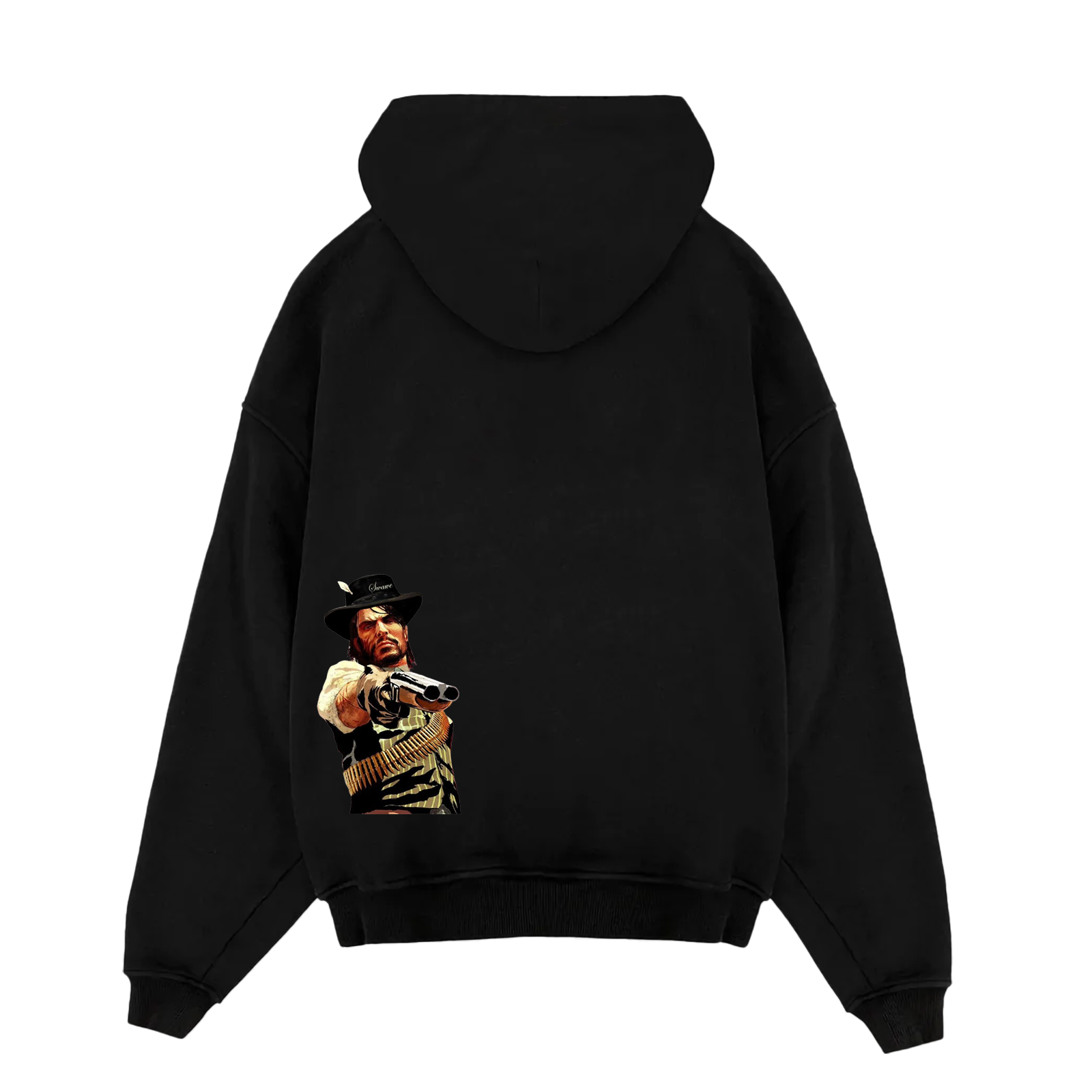 EMBROIDERED LOOSE-FITTING BLACK STREETWEAR HOODIE WITH A RDR CHARACTER EMBROIDERY ON THE BACK